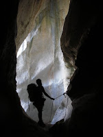 Yo con la frontal en el casco preparada para la "oscuridad" del lago subterráneo ja ja ja jaj ja ja!!! Vaya desilusión, era otra poza ponzoñosa ja ja ja ja!! Pero bueno, ya estaba, el barranco ya no le quedaba nada, después del "lago subterráneo" ya solo queda pateo pateo pateo, casi dos horas de caos de bloques, de destrepadas y ya llegamos al final.